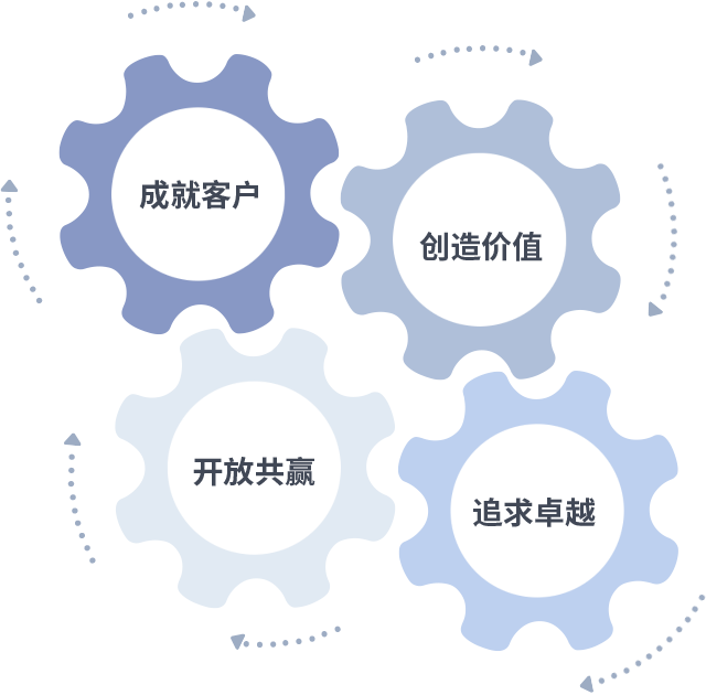 成就客户是一切决策的出发点,创造价值是衡量所有工作的标准,追求卓越是AG刮刮卡做事做人的态度,开放共赢是AG刮刮卡的格局也是最终的结果。价值观的齿轮环环相扣,推动着组织里的每个人不断向前。